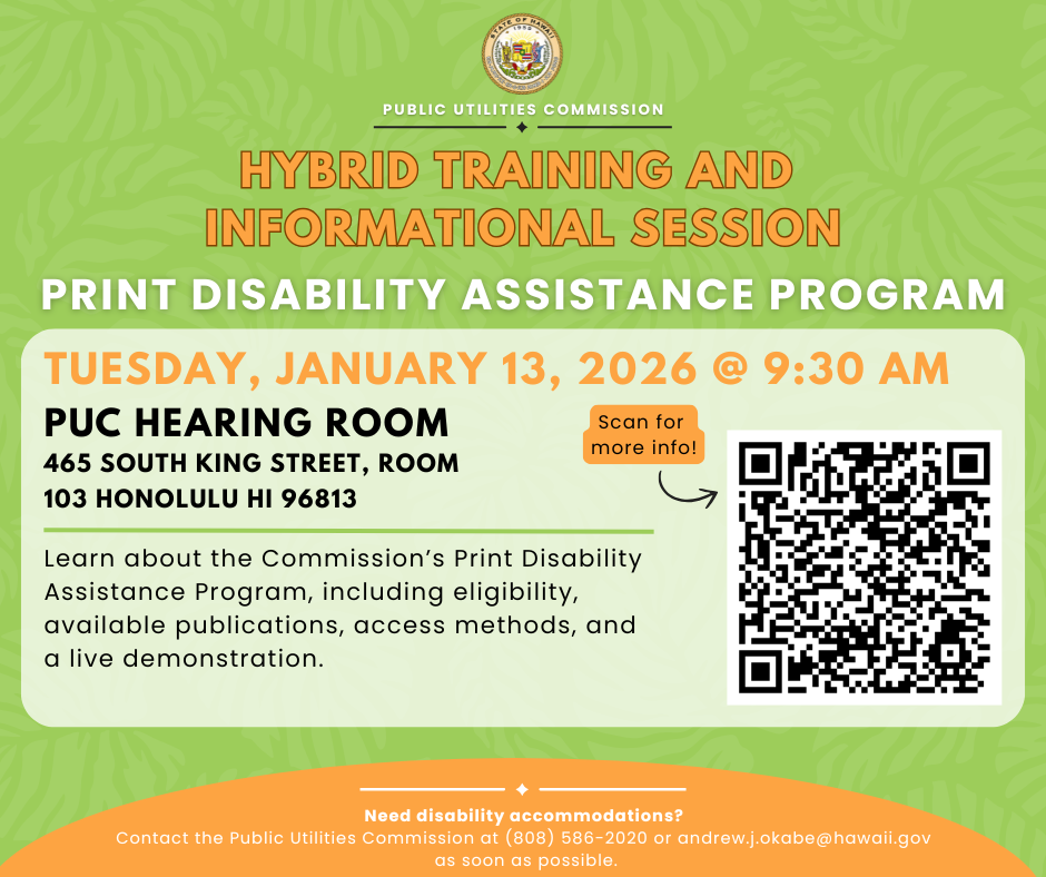 Posted on Dec 30, 2025 in Public NoticeThe Hawaiʻi Public Utilities Commission will host a training session on its Print Disability Assistance Program, also known as NFB-NEWSLINE Hawaii, on Tuesday, January 13, 2026, at 9:30 a.m. This session is open to the public and is especially encouraged for people with print disabilities, including people who are blind or have low vision, as well as organizations that serve them. Attendees may join in-person or virtually.